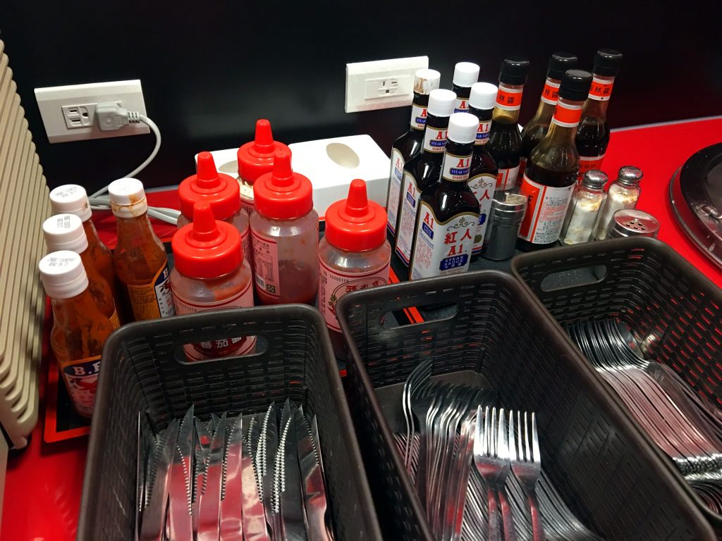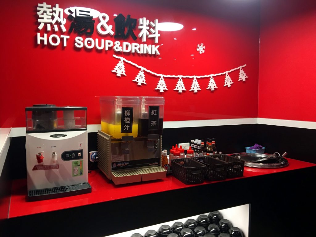 點好餐後,來到自助區,這裡提供熱湯、飲料,餐具與醬料也都能自行取用。