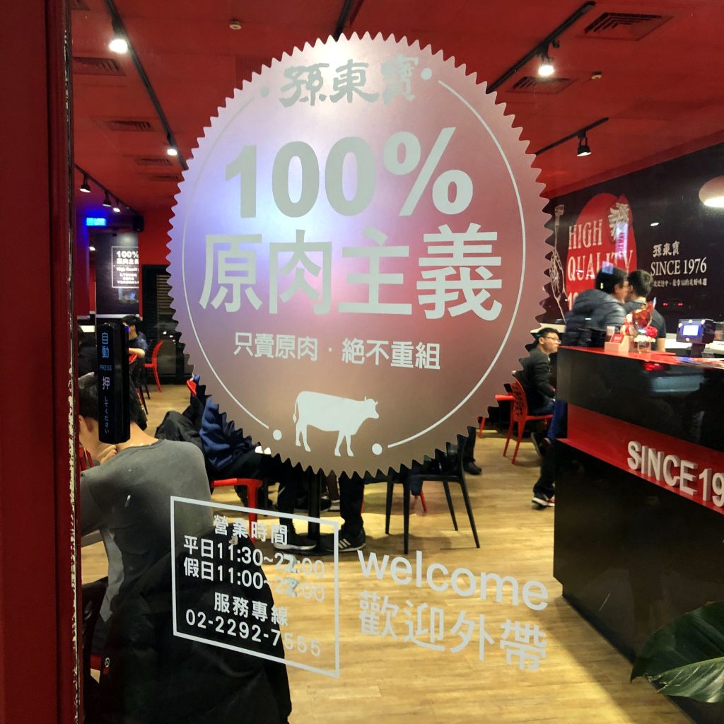 等待的時間,先觀察一下店面的呈現。正門口玻璃上印著「100%原肉主義」,強調只賣原肉、絕不重組,網站文宣上也標示食材通過法國標準協會 ISO22000 及 HACCP 國際衛生食品安全雙認證,讓人用餐時更加安心。