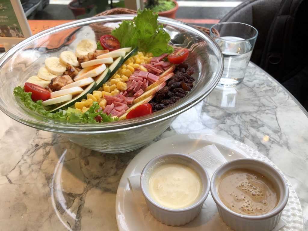 原以為只是清爽的小碗沙拉,沒想到端上桌竟是一大盆。底層鋪滿萵苣,表面堆疊著水煮蛋、番茄、碳烤雞肉丁、水果與核桃,色彩繽紛。沙拉醬可自由搭配,這次選了胡麻醬與優格醬,既可分別沾食,也能豪邁拌勻,風味各有層次。