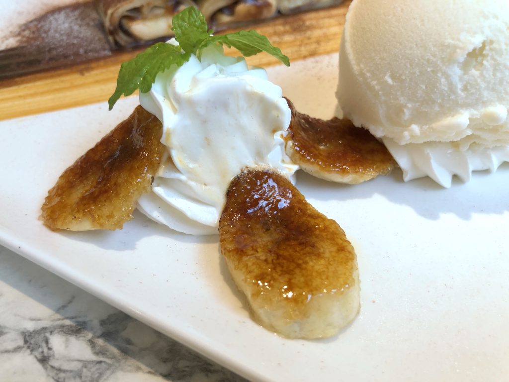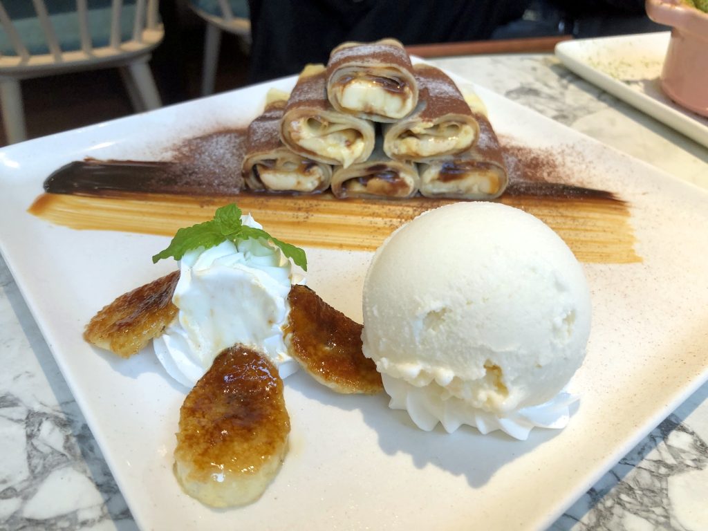 除了香蕉薄餅,盤中還有焦糖香蕉,外層糖衣微脆、內裡柔軟。更令人驚豔的是一旁的牛奶冰淇淋,濃郁純粹的奶香,讓牛奶控絕對會為之瘋狂。