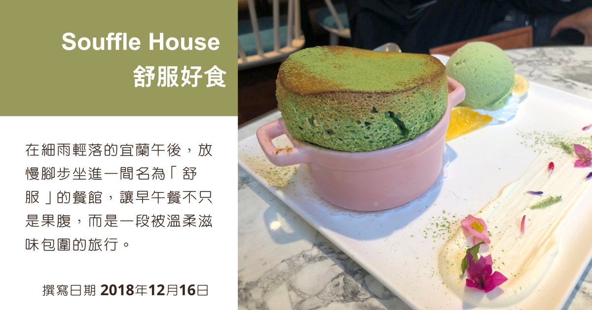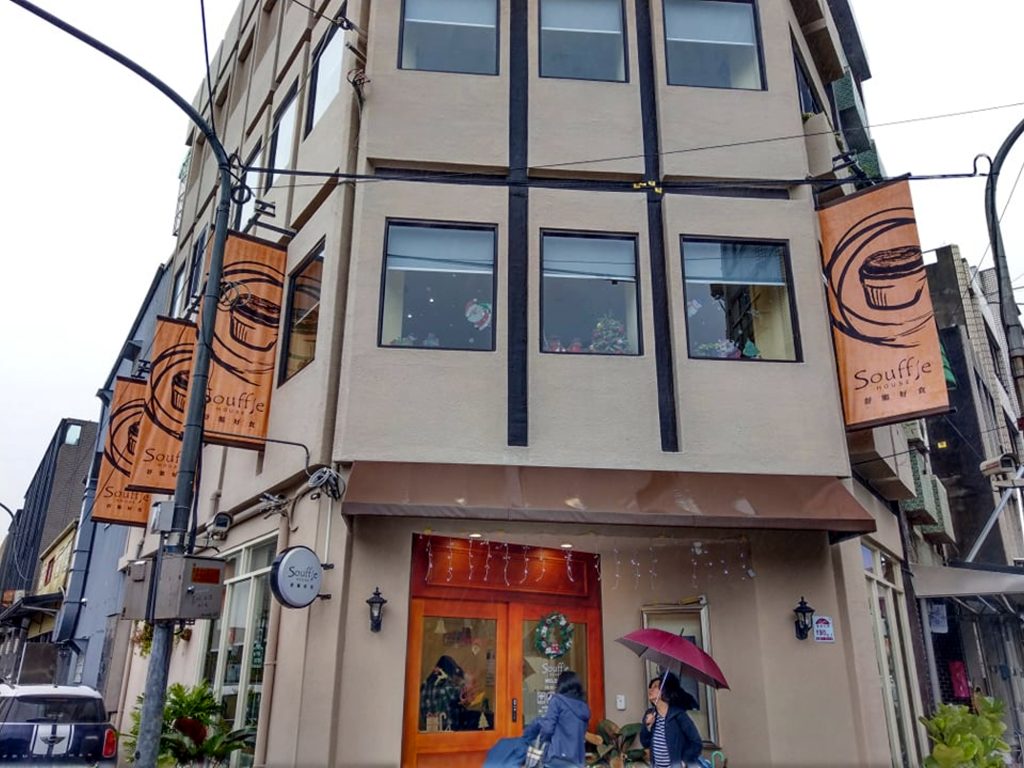 從宜蘭轉運站步行過來大約十五分鐘,天空飄著細雨,為旅程添了幾分詩意。難得離開台北,便用最悠閒的步調前往 Souffle House 舒服好食。店面位在邊間,三層樓的建築相當醒目,二樓垂掛著布簾,初到門口時,已可見準備入內的饕客們,人氣可見一斑。