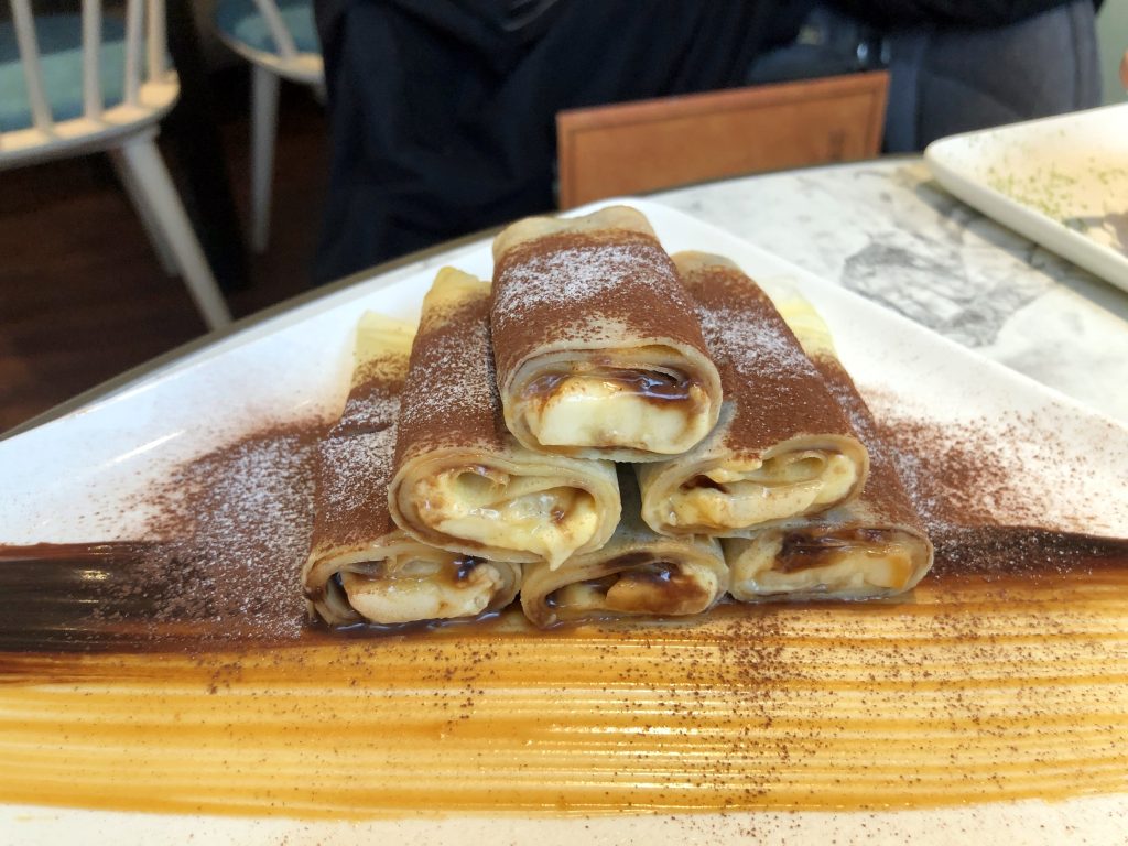 外層撒上可可粉並淋上巧克力醬,柔軟的薄餅包覆著香蕉,內餡彷彿融為一體。