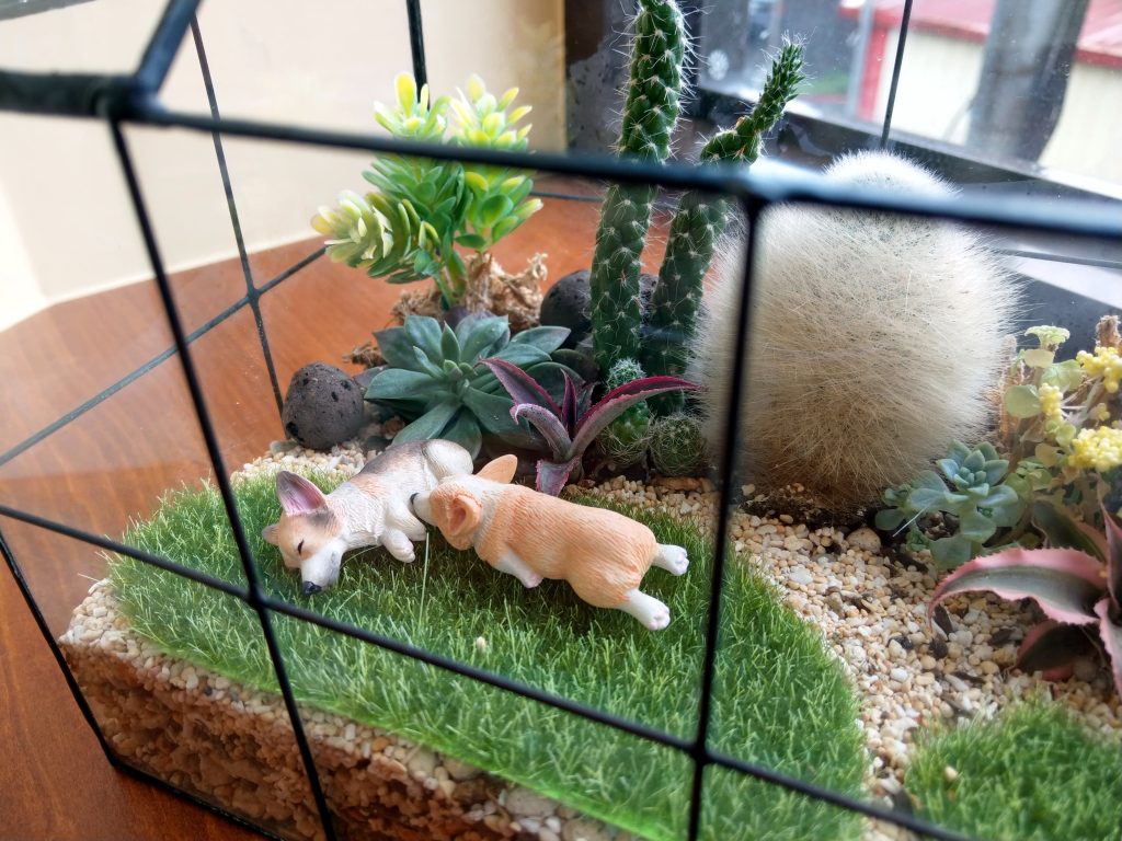 細看之下,還能發現草坪造景中有兩隻柯基犬安靜入睡,搭配多肉植物的擺設,為空間增添不少趣味與溫度。