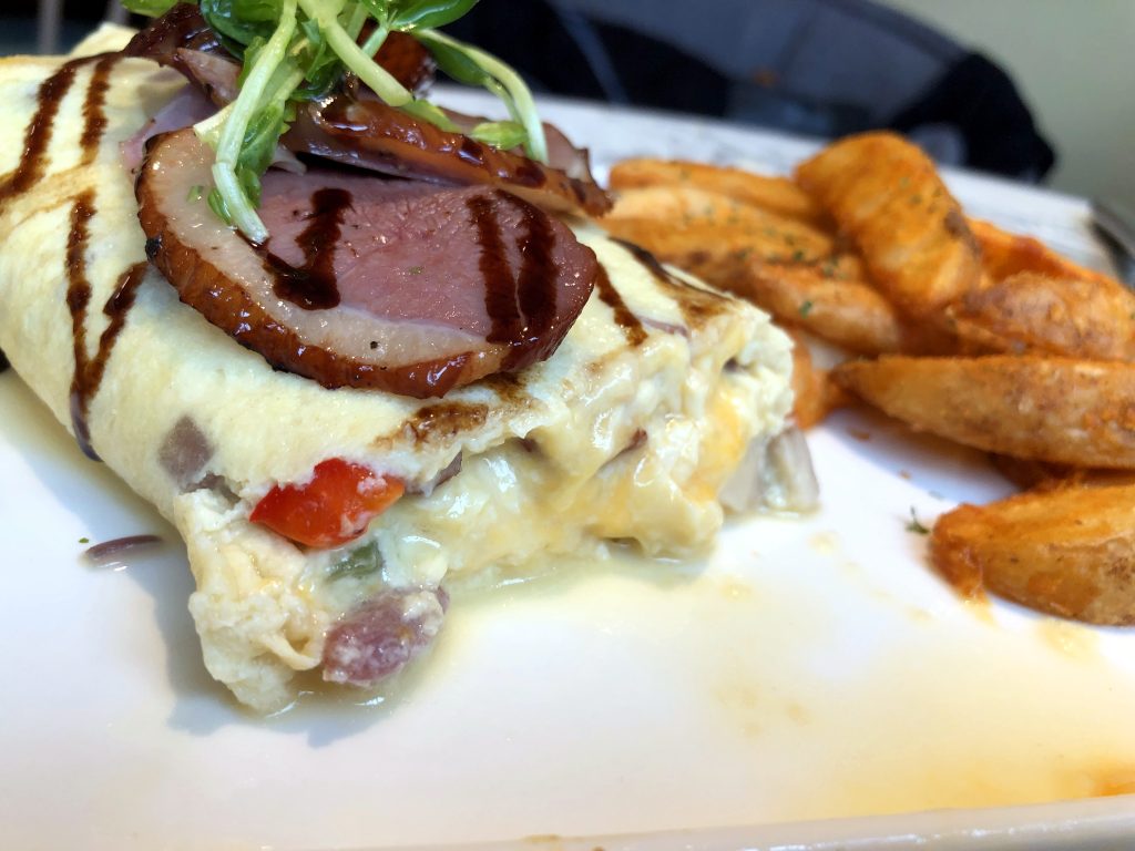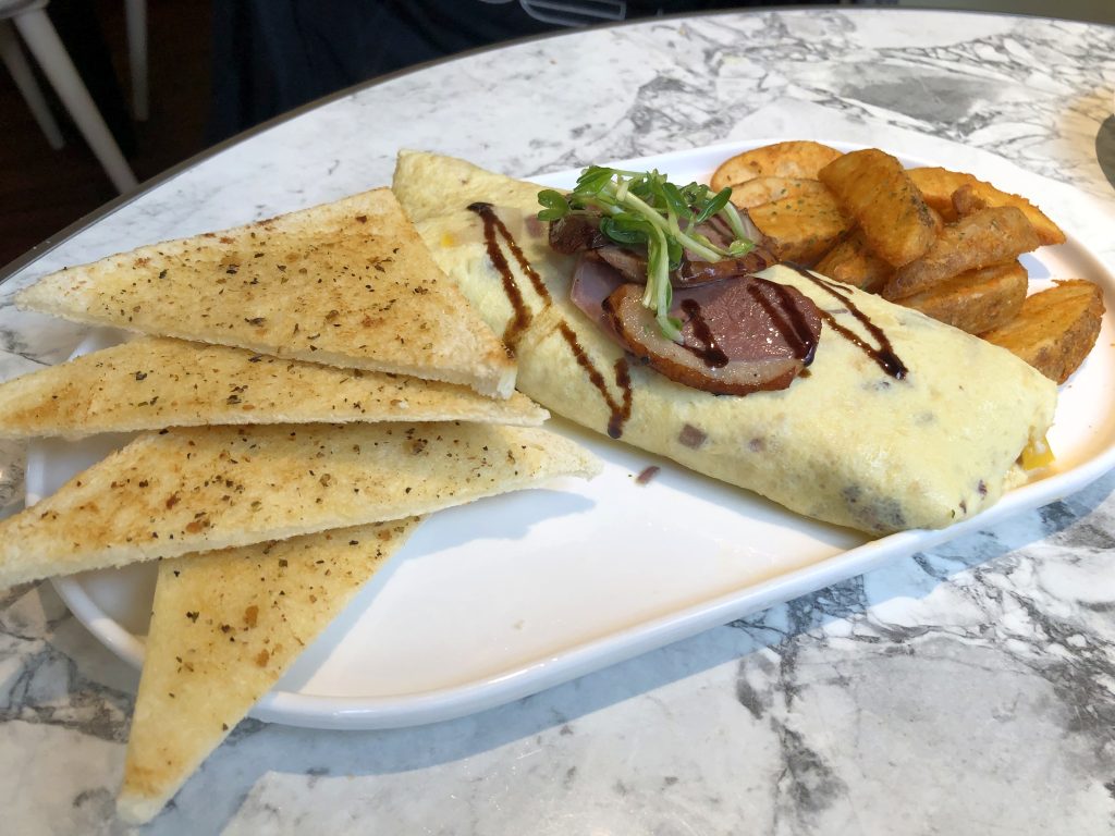 「歐姆蕾」源自英文 omelet,意指煎蛋捲。這份蛋捲內餡包含鴨賞、洋蔥、杏鮑菇、青紅椒與雙色起司,一旁搭配烤吐司、脆薯,並帶有迷迭香等香料氣息,份量相當充足。