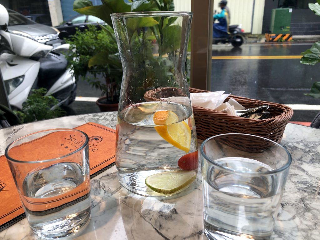 店家安排我們坐在落地窗旁,餐具與水杯早已備妥,水瓶中加入番茄、檸檬片與柳橙片提味,清爽宜人。窗外雨勢似乎又大了些,室內卻顯得格外安穩。