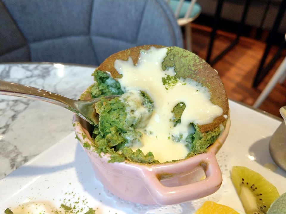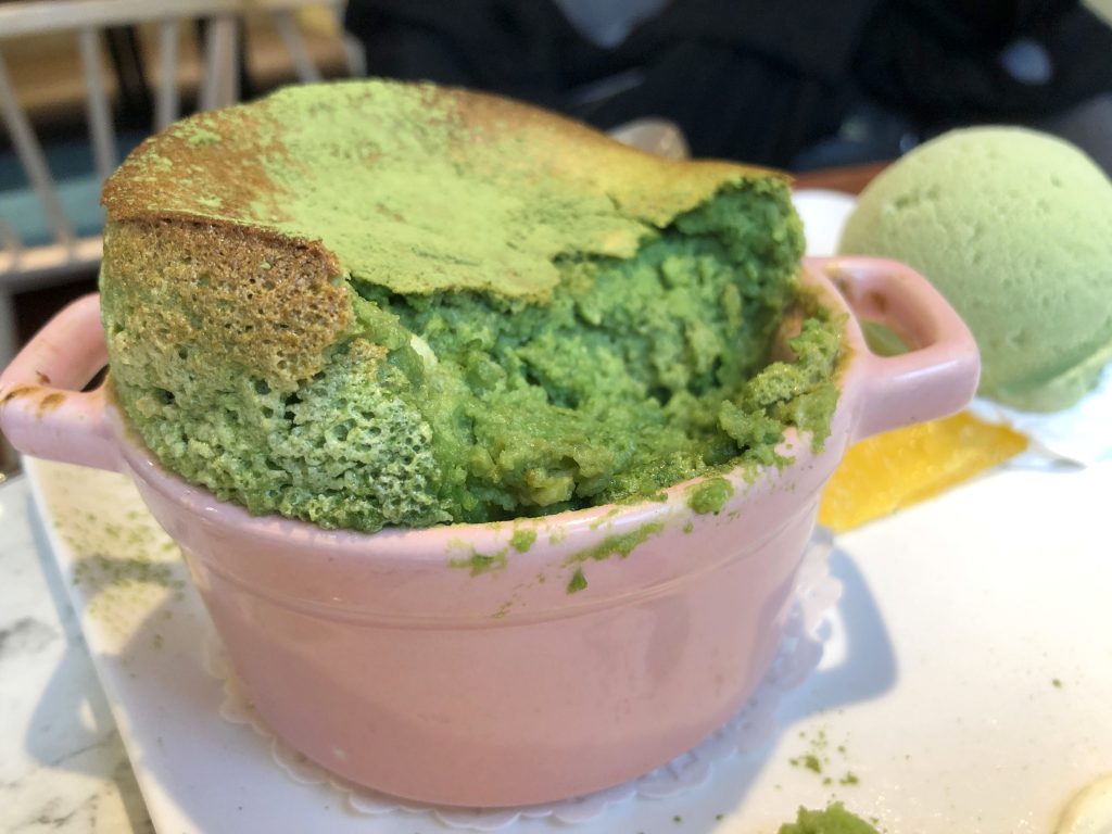 餐後甜點終於登場——店內招牌舒芙蕾。烤好的舒芙蕾蓬鬆地溢出杯緣,宛如雲朵般輕盈,旁邊搭配一球抹茶冰淇淋,冷熱交錯,彷彿一場冰火交融的甜點演出。