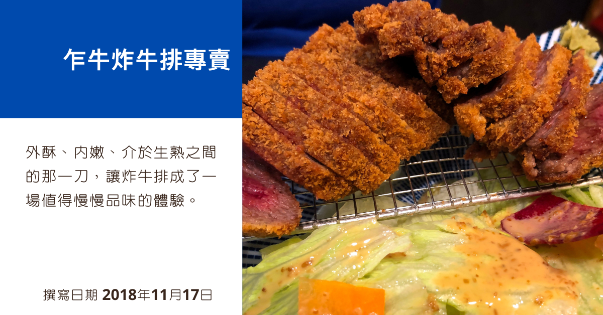 王品集團旗下的品牌版圖愈來愈廣,攻略清單自然也愈拉愈長。這一次,先從一直讓人好奇的 乍牛 炸牛排 開始。前陣子看到朋友分享用餐照片,炸牛排那介於生熟之間的切面實在太誘人,於是找了一天,親自來體驗這股來自日本風格的炸牛排魅力。