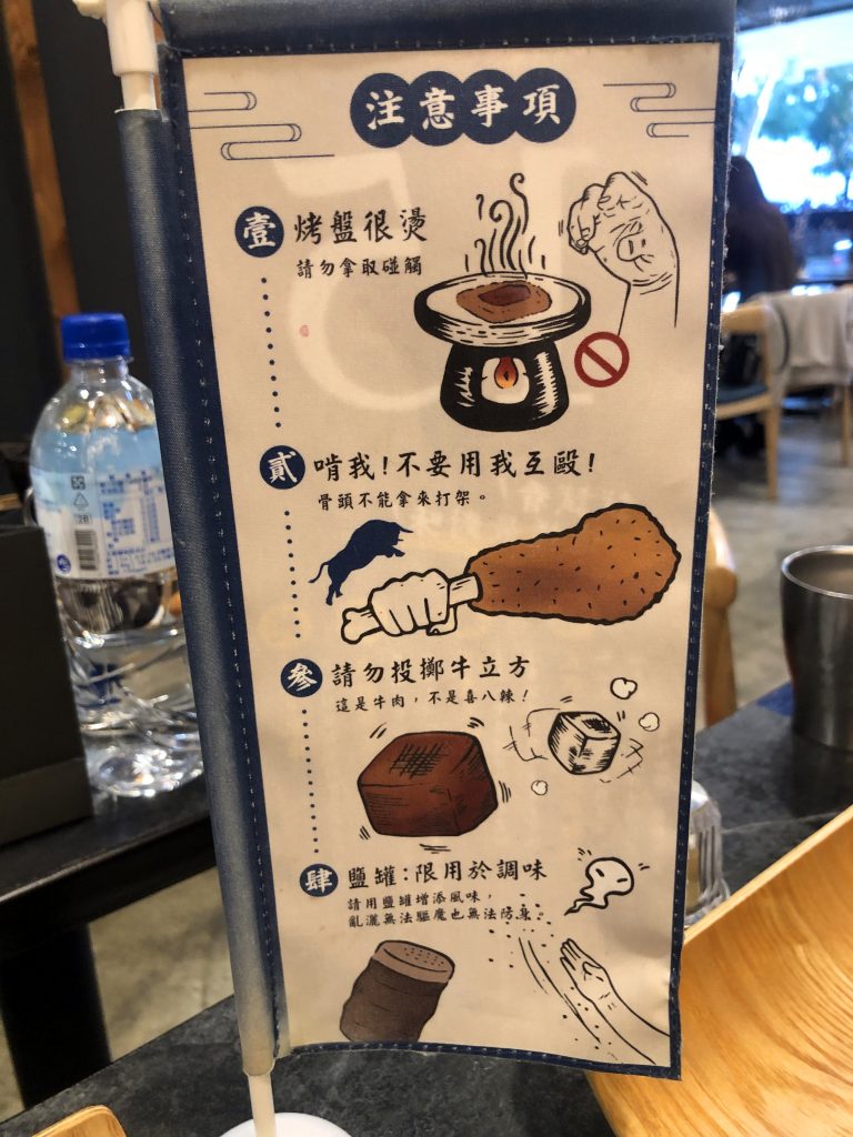 桌邊告示提醒,可以將牛排放在烤盤上稍微再煎一下,讓表面多一點焦香,也讓不習慣生肉口感的人安心不少,這樣的設計相當貼心。