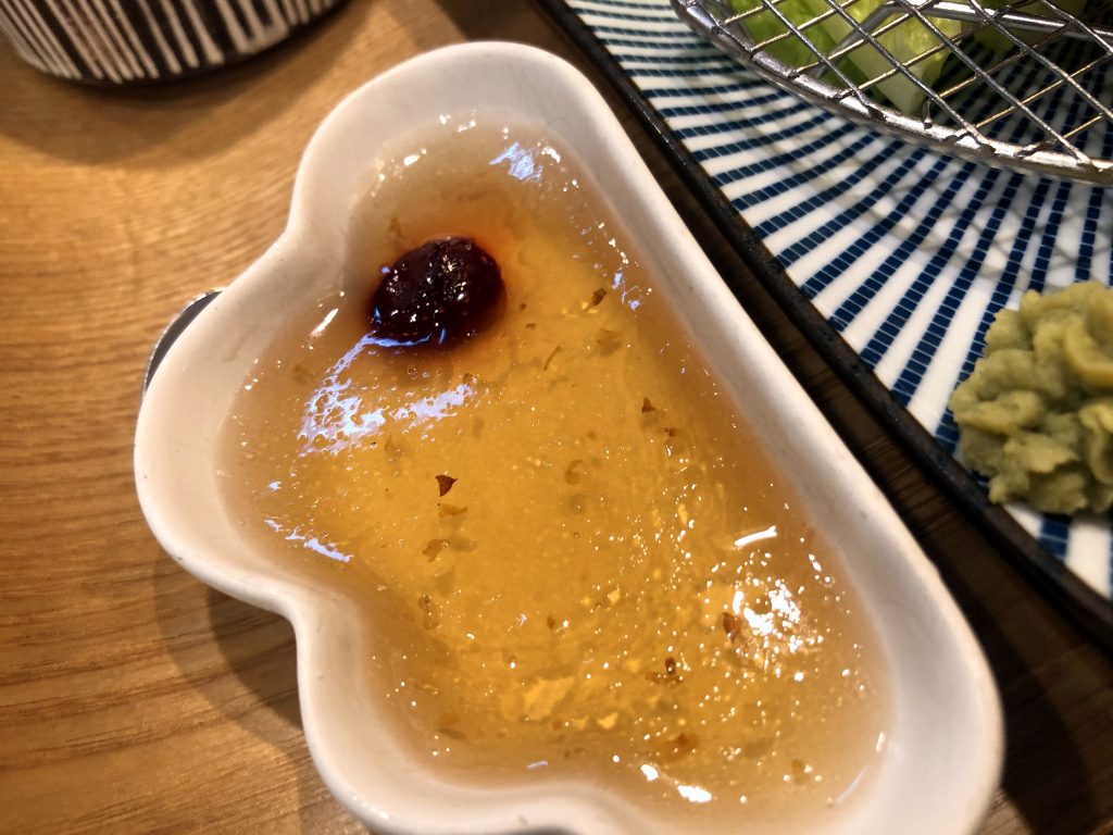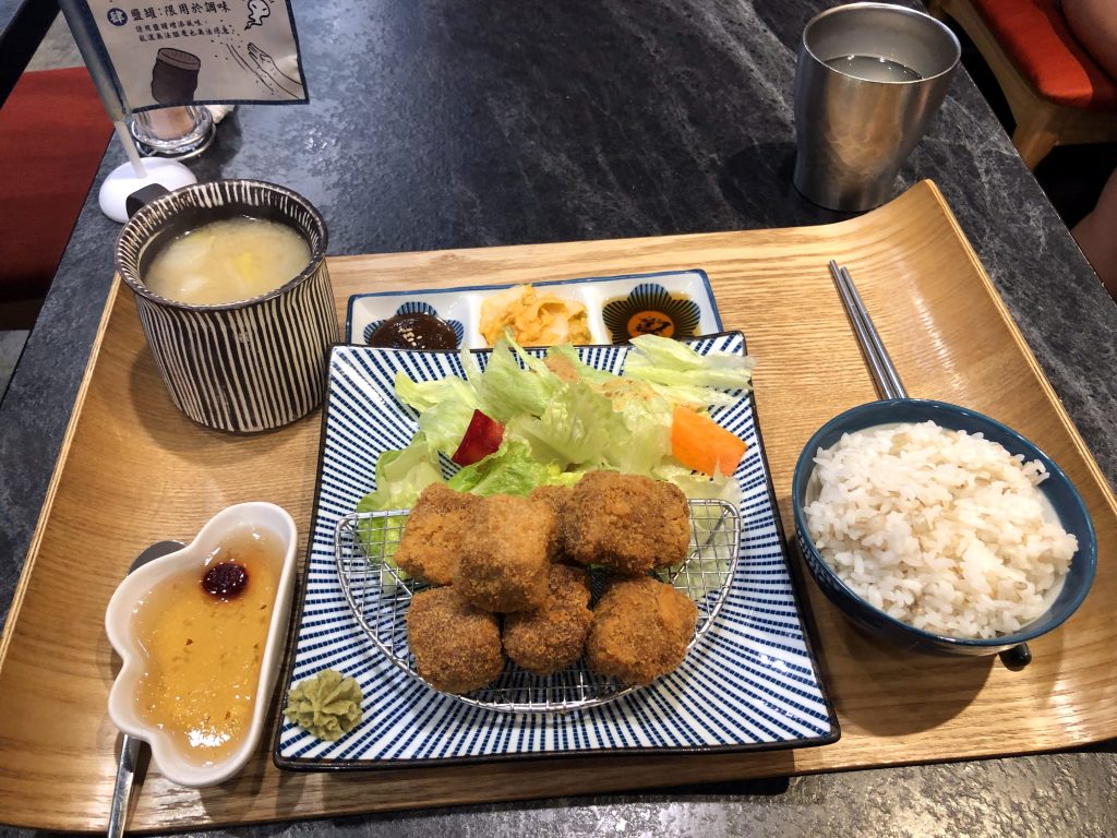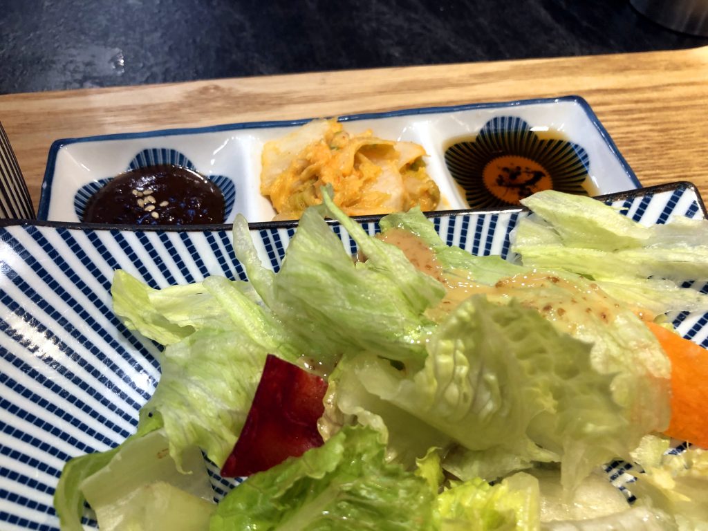 生菜沙拉使用的是胡麻醬,近來似乎越來越少看到油醋或和風醬,胡麻醬反而成了主流。定食中也附上黃金泡菜,生菜與泡菜正好能化解炸物的油膩感。沾醬則有味噌醬與梅汁醬油,桌邊還放了玫瑰鹽與芥末胡椒,讓人依照口味自由搭配。