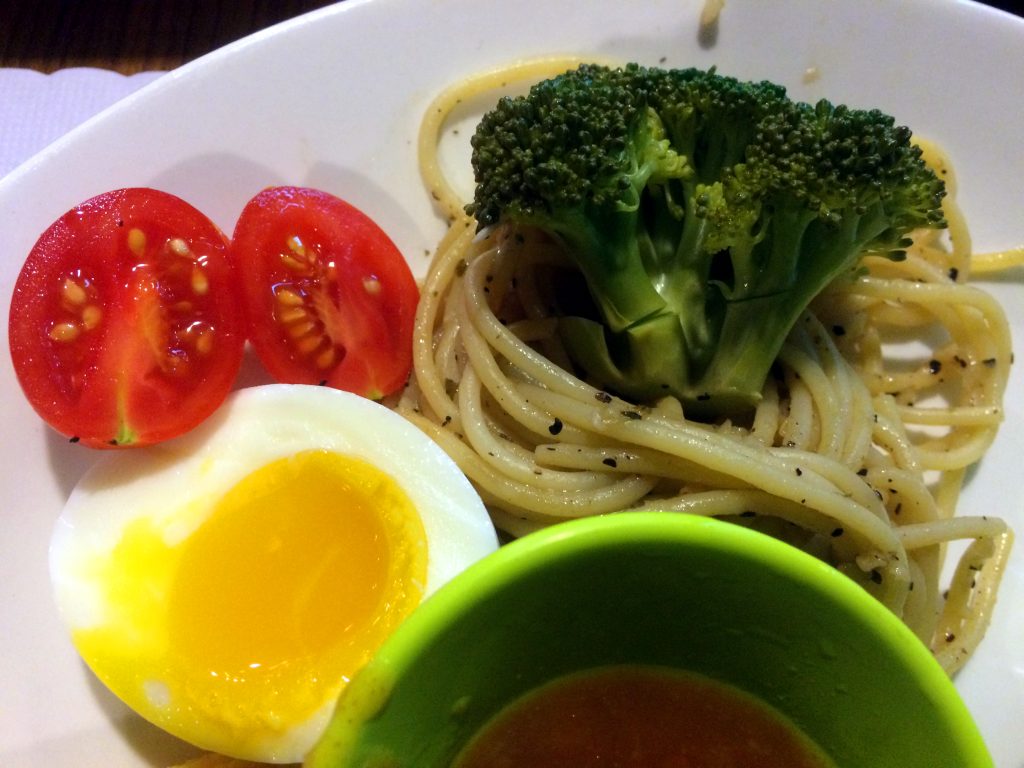 配餐並未走傳統鐵板麵路線,而是改以青醬義大利麵呈現,羅勒香氣清新,與牛肉的油脂形成對比。佐以花椰菜、小番茄,並附上半顆糖心蛋,整體視覺與營養配置都顯得用心,也讓套餐多了一分西式餐館的完整度。