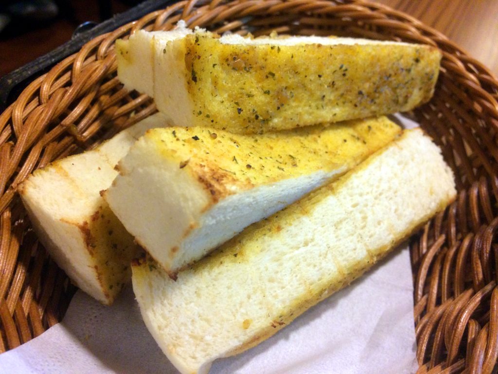 附餐麵包選用厚切吐司條,表面抹上蒜味奶油,經過烘烤後外酥內軟,蒜香不嗆,油脂恰到好處,是經典而不易出錯的搭配。