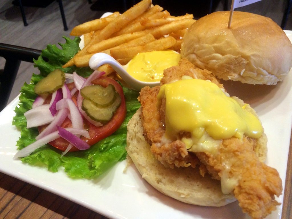 朋友點的是塔塔魚柳漢堡。魚柳炸得金黃酥脆,淋上塔塔醬後風味更加圓潤,一旁的薯條似乎也能沾著同樣的醬汁享用。對於塔塔醬愛好者而言,這無疑是一個令人滿足的選擇。