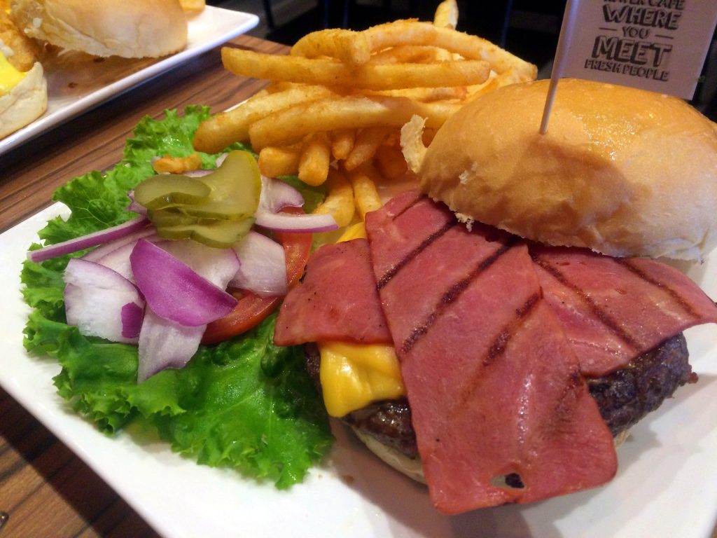重頭戲登場。對於吃遍百家漢堡的人來說,評價自然會回到漢堡本身。這裡的培根口感更接近火腿,幾乎由瘦肉構成。理論上培根指的是煙燻豬胸肉,火腿則來自腿肉,但實際形狀並不容易分辨。這裡的培根略經炙烤,保留肉質的鮮嫩,搭配生菜與薯條,走的是穩健路線。