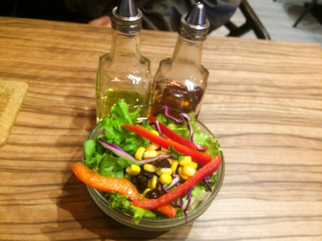 沙拉的色彩相對繽紛,油與醋可自行調配,可惜當時拍攝的照片略顯模糊,只能憑記憶回味。