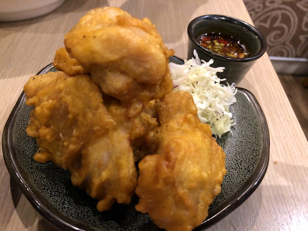 跳脫傳統椒麻雞的薄片形式,改以日式唐揚手法呈現。雞塊厚實多汁,外酥內嫩,搭配泰式椒麻醬,麻香中帶著溫和的小辣。由於雞塊本身厚度十足,建議多沾幾次醬汁,風味層次會更加完整;若想單純享受雞肉原味,也能酌量點到為止。