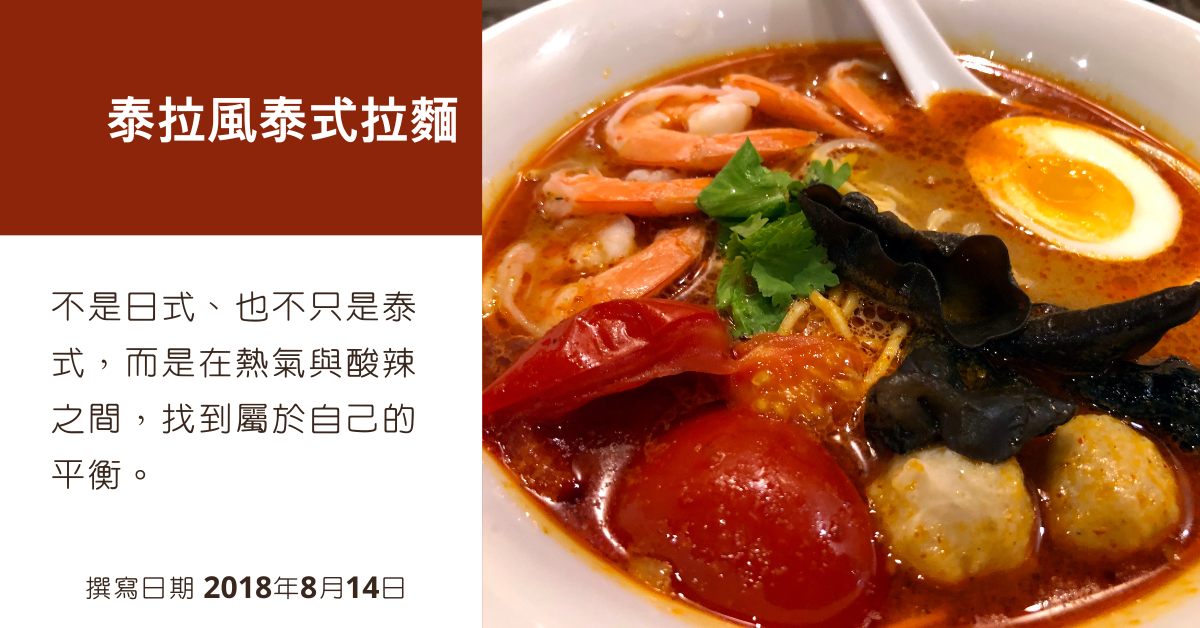 好久沒有走到公館街了。平日覓食多半以板橋車站為中心,不是中山路一帶,就是文化路沿線,久而久之,熟悉得有些乏味。這天心血來潮,刻意沿著文化路多走了一段,卻始終找不到讓人眼睛一亮的新店。轉進公館街後,遠遠看見一面紅色招牌,上頭寫著「泰拉風」,心裡一動:莫非是泰式拉麵?走近一看,果然如此,像是偶然撞見的一場小驚喜。
