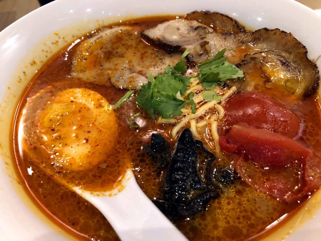 朋友點的鮮蝦麵視覺效果十足,蝦子整齊排放,搭配糖心蛋,份量與賣相兼具。湯頭酸辣平衡,不會過於刺激;若不偏好酸味,店內也提供咖哩與檸香等不同取向的選擇,照顧到更多口味偏好。