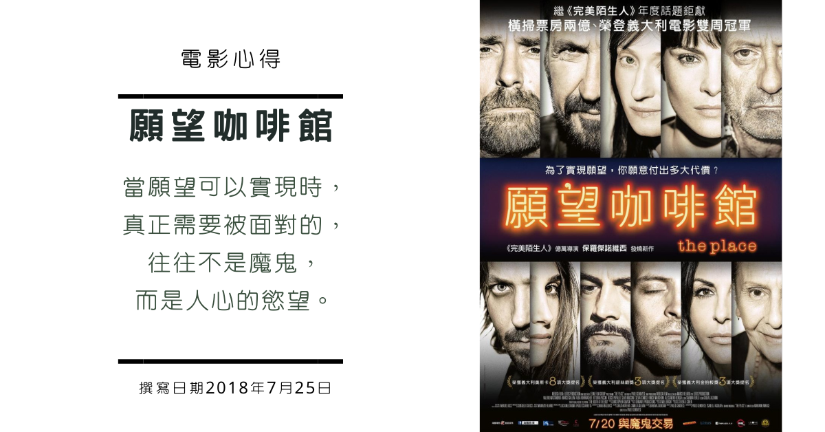 《願望咖啡館》(The Place)是義大利導演保羅傑諾維西(Paolo Genovese)的最新作品。羅傑諾維西曾在前作《完美陌生人》,讓7個好友在一張餐桌上,共玩一個分享彼此電話、簡訊的危險遊戲,口碑票房均獲得巨大的成功。這次他在新作《願望咖啡館》中做的更極致、玩得更絕,片中場景簡單俐落,劇情卻花俏燒腦,被義大利電影論壇(Cineforum)譽為「義大利電影的新標竿」,也讓他成為當代燒腦電影的箇中高手。