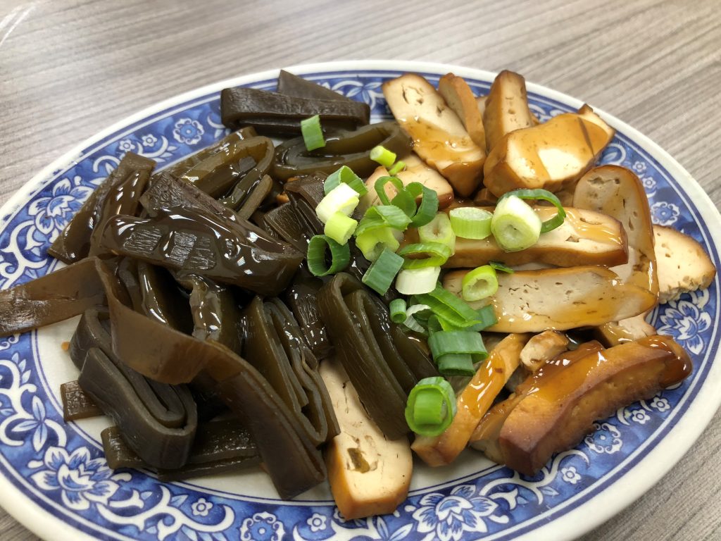 小菜則點了最經典的組合:豆干與海帶。這幾乎是台灣麵店裡最傳統的搭配,簡單卻耐吃。若不是因為麵裡已經有半顆蛋,其實再來一顆滷蛋,整體的「麵店儀式感」就更完整了。