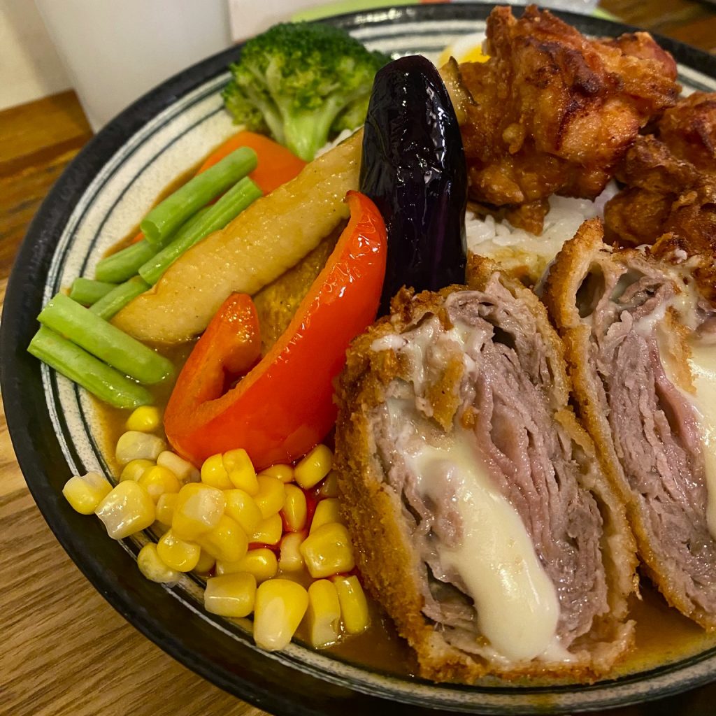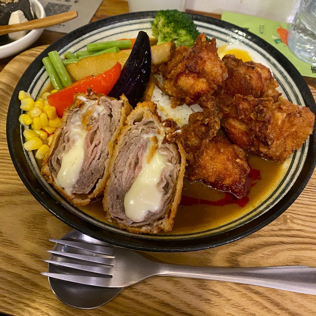 主餐上桌時,視覺與香氣同時到位。濃稠的日式咖哩醬,色澤深沉,帶著溫潤的辛香與微甜氣息,包覆著白飯與配料。這不是強烈刺激的辛辣,而是一種耐吃、層次堆疊的風味,適合一口接一口地慢慢品嚐。一份餐點中,同時呈現炸物與蔬菜,讓口感與味道形成平衡,也展現出店家在組合設計上的用心。
