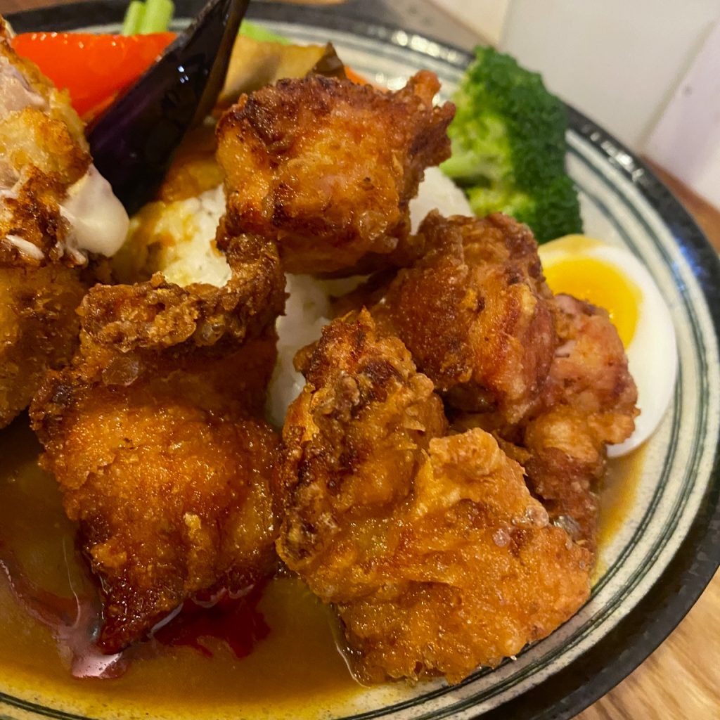 唐揚雞則走的是另一種路線。外皮薄脆,帶點日式醬油與蒜香的醃漬氣息,內部仍保有肉汁。咬下時的酥脆聲響,與咖哩的濃厚形成對比,讓整體口感更加立體。
